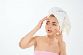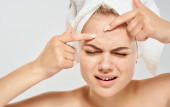 niezadowolona kobieta wskazująca palcem w twarz z pryszczem wyizolowanym na beżu