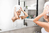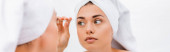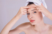 naga kobieta w ręczniku patrząc w lustro i dotykając twarzy z pryszcz izolowane na beżu