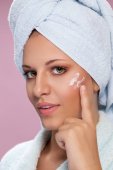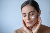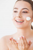 atrakcyjna i naga kobieta stosująca krem na rękę izolowany na beżu