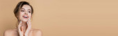 panoramiczne ujęcie zaskoczonej dziewczyny dotykającej twarzy pryszczami i patrzącej na lustro odizolowane na beżu