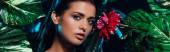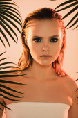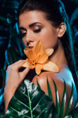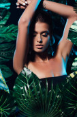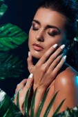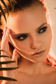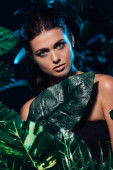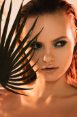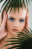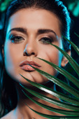 zbliżenie młodej kobiety zakrywającej twarz zielonym liściem