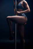 atrakcyjna striptizerka w bieliźnie siedząca obok bieguna na niebiesko-pomarańczowym
