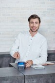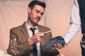 częściowy widok kelnera z terminalem płatniczym w pobliżu przystojnego mężczyzny trzymającego kartę kredytową podczas siedzenia w restauracji
