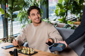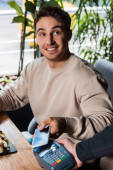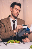 częściowy widok kelnera z terminalem płatniczym w pobliżu eleganckiego człowieka posiadającego kartę kredytową podczas siedzenia w restauracji