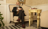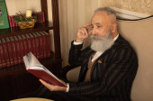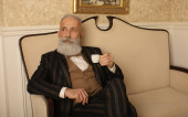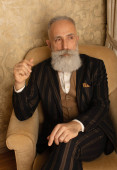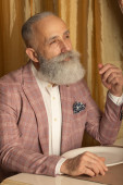 starszy przystojny skoncentrowany mężczyzna z broda w biznes garnitur siedzi i pije kawę.