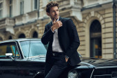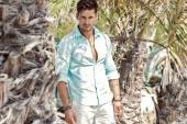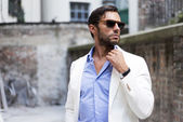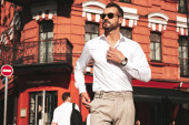 Stylowy mężczyzna w okularach przeciwsłonecznych i białej koszuli