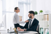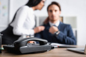 profesjonalny tłumacz męski pracujący online z laptopem i słuchawkami na spotkaniu z businesswoman
