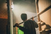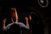 selektywne skupienie złego demona z lewitującymi naczyniami i egzorcystą z krzyżem i biblią w kuchni