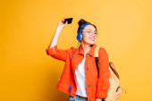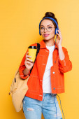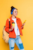 szczęśliwy student w okularach dotykając słuchawek podczas uśmiechania się aparat odizolowany na żółto