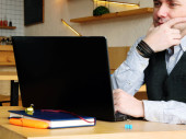 Młody człowiek czyta tekst na laptopie i myśli w kawiarni.