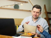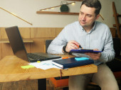 Zdjęcie "Młody człowiek czyta tekst na laptopie i myśli w kawiarni." może być wykorzystywane do celów osobistych i komercyjnych zgodnie z warunkami zakupionej licencji Royalty-free. Obraz jest dostępny do pobrania w jakości wysokiej rozdzielczości do 5760x3840.