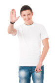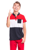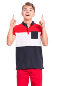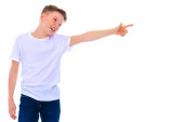 Portret nastolatka wskazującego palcem na przestrzeń - widok z boku, odizolowany na białym tle. Słodki nastolatek uśmiecha się i wskazuje na coś palcami. Szczęśliwe dziecko odwracając wzrok - profil.