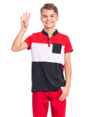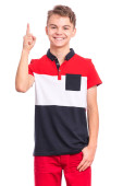 Zdjęcie "Portret nastolatka wskazującego palcem na przestrzeń - widok z boku, odizolowany na białym tle. Słodki nastolatek uśmiecha się i wskazuje na coś palcami. Szczęśliwe dziecko odwracając wzrok - profil." może być wykorzystywane do celów osobistych i komercyjnych zgodnie z warunkami zakupionej licencji Royalty-free. Obraz jest dostępny do pobrania w jakości wysokiej rozdzielczości do 5760x3840.