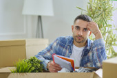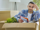 Zdjęcie "Przystojny mężczyzna z pudełkami w nowym mieszkaniu po przeprowadzce" może być wykorzystywane do celów osobistych i komercyjnych zgodnie z warunkami zakupionej licencji Royalty-free. Obraz jest dostępny do pobrania w jakości wysokiej rozdzielczości do 5760x3840.