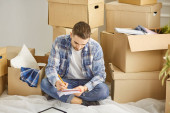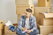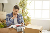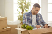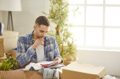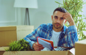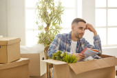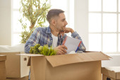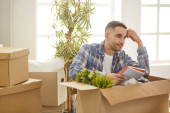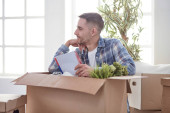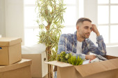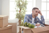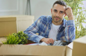 Przystojny mężczyzna z pudełkami w nowym mieszkaniu po przeprowadzce
