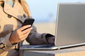 Blisko kobiety ręce za pomocą smartfona z tła ulicy miasta