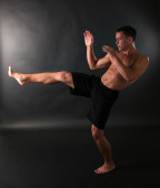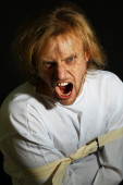 chory psychicznie człowiek w kaftan na czarnym tle