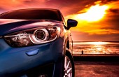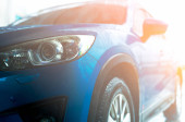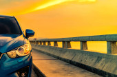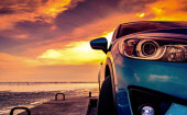 Niebieski luksusowy samochód SUV zaparkowany na betonowej drodze przy plaży morskiej z pięknym czerwonym niebem zachód słońca. Wakacje na tropikalnej plaży. Wycieczka. Przedni widok sportowy i nowoczesny design SUV-a. Letnia podróż samochodem.