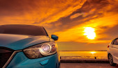 Zdjęcie "Niebieski luksusowy samochód SUV zaparkowany na betonowej drodze przy plaży morskiej z pięknym czerwonym niebem zachód słońca. Wakacje na tropikalnej plaży. Wycieczka. Przedni widok sportowy i nowoczesny design SUV-a. Letnia podróż samochodem." może być wykorzystywane do celów osobistych i komercyjnych zgodnie z warunkami zakupionej licencji Royalty-free. Obraz jest dostępny do pobrania w jakości wysokiej rozdzielczości do 5760x3840.