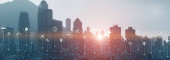 Technologia Internet rzeczy komunikacji bezprzewodowej iot sieci koncepcji. Nowoczesne miasto panorama podwójna ekspozycja mieszane media.