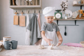 Młoda szczęśliwa mama i jej dziecko gotują ciasteczka w domu w kuchni. Boże Narodzenie domowy piernik. słodkie chłopiec z matka w biały mundur i kapelusz gotowane ciasteczka czekoladowe