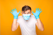 środek czyszczący w masce medycznej pokazujący ręce w gumowych rękawiczkach na niebieskim tle