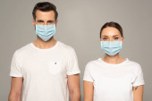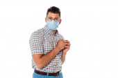 Mężczyzna w masce ochronnej i rękawiczkach lateksowych trzymający słoik ze szczepionką i strzykawką na szaro