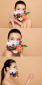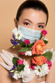 atrakcyjna azjatycka kobieta w lateksowych rękawiczkach i kwiatowej masce na twarz z motylami wyizolowanymi na beżu