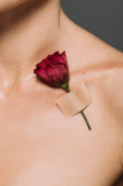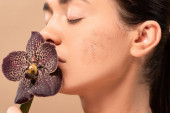 naga dziewczyna w lateksowych rękawiczkach i kwiatowa maska zamykająca oczy odizolowane na beżu