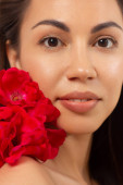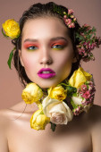 atrakcyjny nagi Azji dziewczyna w świeże kwiaty odizolowane na beżowy