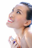 panoramiczny strzał piękny wesoły nagi Azji dziewczyna stosując perfumy na skórę izolowane na beżowy