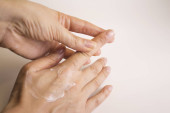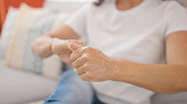 Zbliżenie dorosłej samicy stopy ze złuszczającą się skórą po kąpieli. Uszkodzone złuszczanie skóry