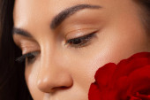 Zdjęcie "Zbliż portret twarzy z piękną cerą i nagim makijażem, kredką do oczu i długimi rzęsami, puszystymi, naturalnymi ustami i białymi kwiatami. Fotografia mody. Kosmetologia i spa. Świeżość wiosny" może być wykorzystywane do celów osobistych i komercyjnych zgodnie z warunkami zakupionej licencji Royalty-free. Obraz jest dostępny do pobrania w jakości wysokiej rozdzielczości do 5760x3840.