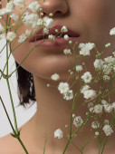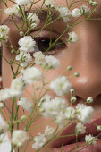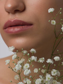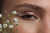 Zbliż portret twarzy z piękną cerą i nagim makijażem, kredką do oczu i długimi rzęsami, puszystymi, naturalnymi ustami i białymi kwiatami. Fotografia mody. Kosmetologia i spa. Świeżość wiosny