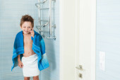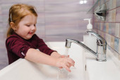piękna kaukaska mała dziewczynka z długimi włosami mycie rąk ze świeżą wodą w łazience