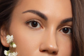 Zbliżenie kobiecych oczu z nagim makijażem. Modne odcienie cienia do powiek, niezwykle długie rzęsy i gęste gładkie brwi. Otwórz piękne spojrzenie. Czysta skóra i białe kwiaty