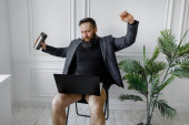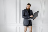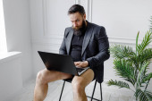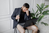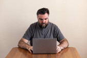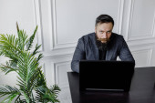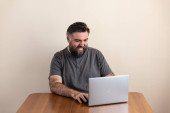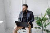 Brodaty mężczyzna w czarnym golfie pracuje w laptopie w domu w jasnym pokoju. Samoizolacja