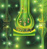 Neurony, naukowe oznaczenie. Synapsa strukturalna. Neuronal z komórką nerwową. Sygnał w mózgu. Przekazywanie impulsów w żywym organizmie. Ilustracja
