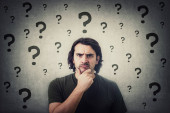 Zdjęcie "Biznesmen trzyma rękę pod podbródkiem, troskliwy gest, patrząc w przyszłość skupiony, myśląc o odpowiedziach na różne pytania w głowie. Symbole znaków przesłuchania. Zamyślony student rozważa rozwiązania." może być wykorzystywane do celów osobistych i komercyjnych zgodnie z warunkami zakupionej licencji Royalty-free. Obraz jest dostępny do pobrania w jakości wysokiej rozdzielczości do 5760x3840.