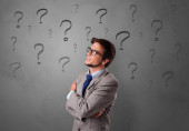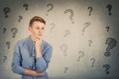 Biznesmen trzyma rękę pod podbródkiem, troskliwy gest, patrząc w przyszłość skupiony, myśląc o odpowiedziach na różne pytania w głowie. Symbole znaków przesłuchania. Zamyślony student rozważa rozwiązania.