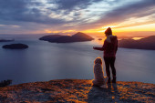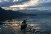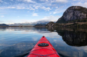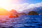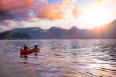 Fantasy Image Composite of Adventurous People na drewnianym czerwonym kajaku