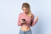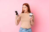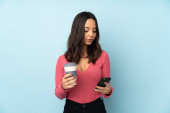 Nastolatka w żółtej bluzie na odizolowanym fioletowym tle z kawą do zabrania i komórką