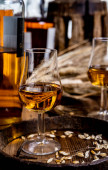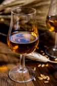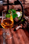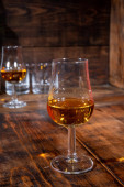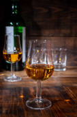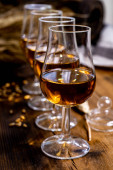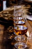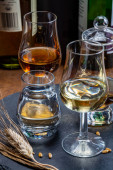 Szklanki do degustacji ze starą szkocką whisky lub amerykańskim burbonem na starym ciemnodrewnianym stole vintage z ziarnem jęczmienia