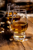Szklanki do degustacji ze starą szkocką whisky lub amerykańskim burbonem na starym ciemnodrewnianym stole vintage z ziarnem jęczmienia