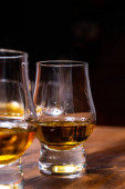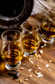 Małe kieliszki degustacyjne ze starą szkocką whisky na starym ciemnym drewnianym stole vintage z ziarnem jęczmienia zbliżyć