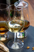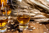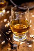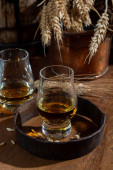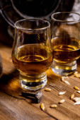 Małe kieliszki degustacyjne ze starą szkocką whisky na starym ciemnym drewnianym stole vintage z ziarnem jęczmienia zbliżyć
