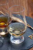 Speyside szkockiej degustacja whisky na starym ciemnym drewnianym stole vintage z ziaren jęczmienia zbliżyć