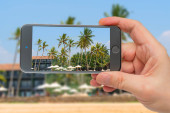 Zdjęcie "Piaszczysta plaża nad oceanem na ekranie smartfona. Letni słoneczny dzień w tropikach. Palmy na plaży." może być wykorzystywane do celów osobistych i komercyjnych zgodnie z warunkami zakupionej licencji Royalty-free. Obraz jest dostępny do pobrania w jakości wysokiej rozdzielczości do 5760x3840.