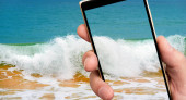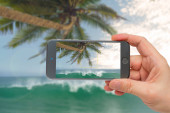 Piaszczysta plaża nad oceanem na ekranie smartfona. Letni słoneczny dzień w tropikach. Palmy na plaży.