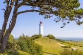 Klasyczny widok na słynną latarnię morską Dornbusch na pięknej wyspie Hiddensee z kwitnącymi kwiatami w lecie, Morze Bałtyckie, Meklemburgia-Pomorze Przednie, Niemcy